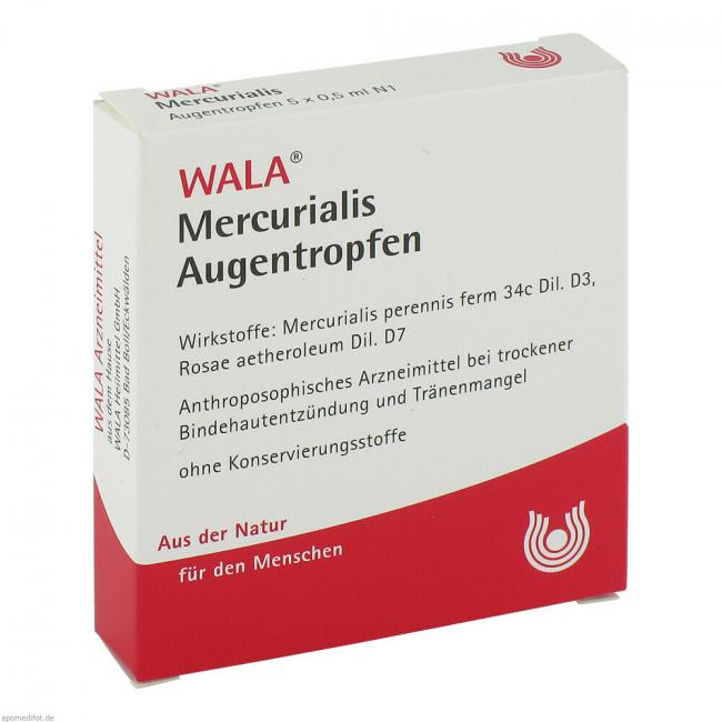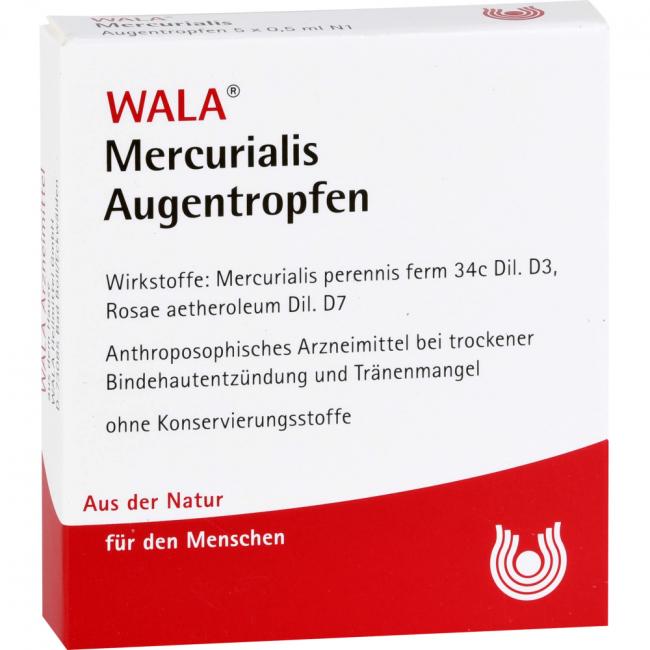 Mercurialis Augentropfen. Anwendungsgebiete: Gemäß der anthroposophischen Menschen- und Naturerkenntnis. Dazu gehören: Anregung des Flüssigkeitsorganismus im Augenbereich bei trockener Bindehautentzündung, Tränenmangel.