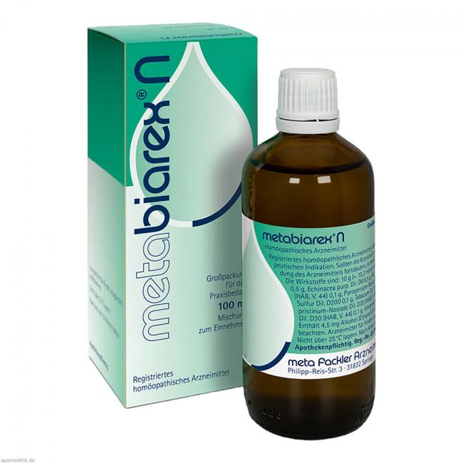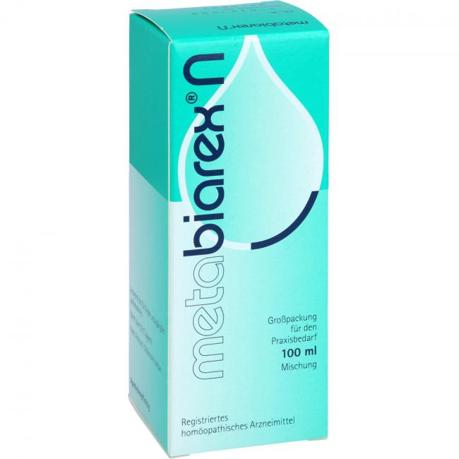metabiarex N ist eine farblose Flüssigkeit und in Braunglasflaschen mit Tropfaufsatz und Kunststoffverschluss enthalten. Wie bei allen Naturstoffpräparaten können gelegentlich Trübungen auftreten, die aber keinerlei Einfluss auf die Wirksamkeit haben. metabiarex N Mischung ist in einer Packung zu 50 ml (N1) erhältlich.