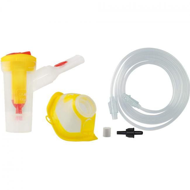 RF 7 plus Kindervernebler, Mundstück mit Ausatemventil, Druckluftschlauch, Filter Kompressor, Universaladapter (zum Anschluss an andere Kompressoren*), Softmaske Kind und Gebrauchsanweisung.
