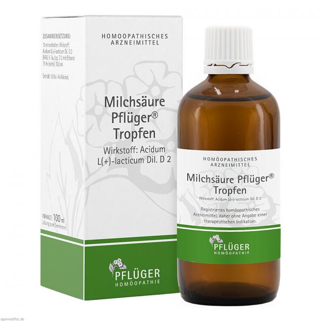 Milchsäure Pflüger Tropfen. Wirkstoff: Acidum L(+)-lacticum Dil. D2. Anwendungsgebiet: Registriertes homöopathisches Arzneimittel, daher ohne Angabe einer therapeutischen Indikation. Warnhinweis: Enthält 18 Vol.-% Alkohol!