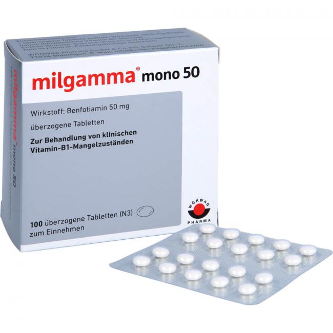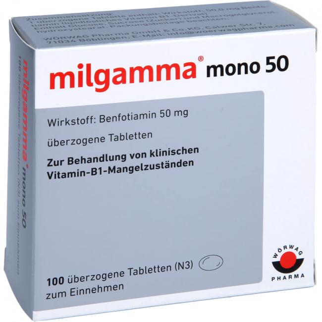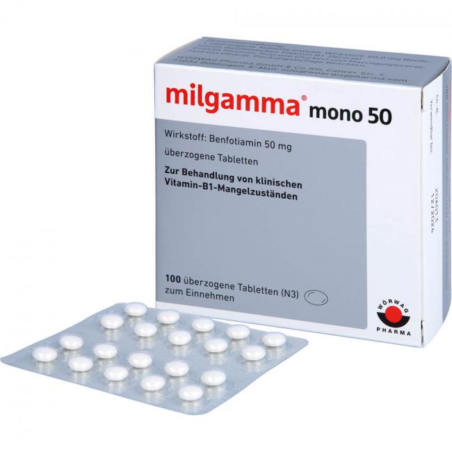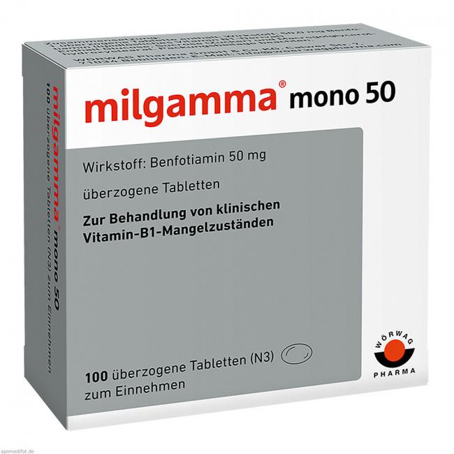 milgamma mono 50 überzogene Tabletten. Wirkstoff: Benfotiamin 50 mg. Anwendungsgebiet: Gesicherte Anwendungsgebiete für die Monopräparate sind ausschließlich Therapie oder Prophylaxe von klinischen Vitamin B1-Mangelzuständen, sofern diese nicht ernährungsmäßig behoben werden können, Behandlung von Neuropathien und kardiovaskulären Störungen, die durch Vitamin B1-Mangel hervorgerufen werden.