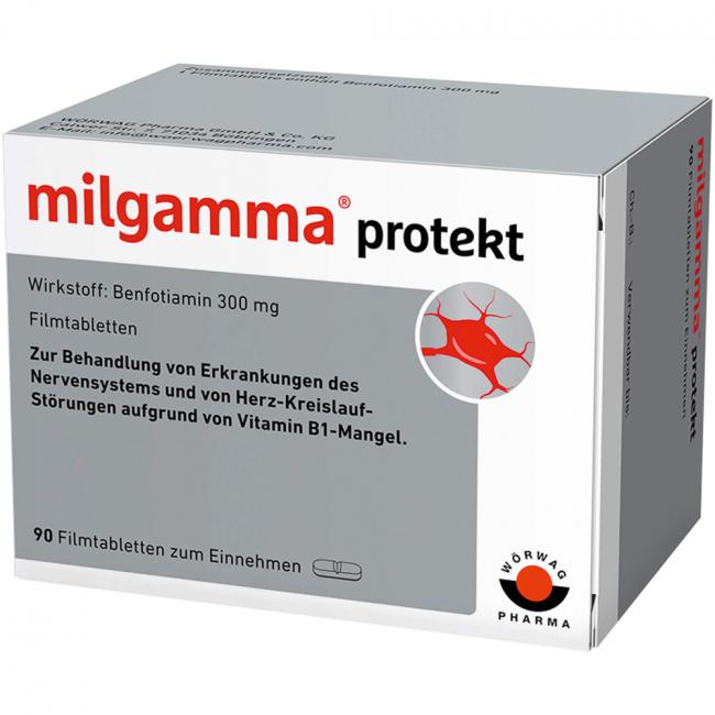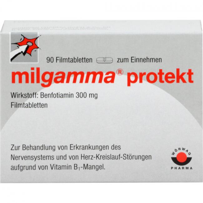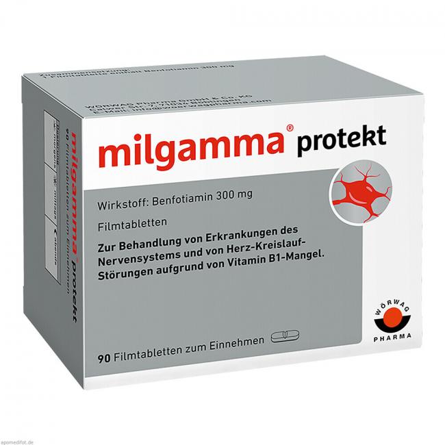 milgamma protekt Filmtabletten. Wirkstoff: Benfotiamin 300 mg. Anwendungsgebiet: Gesicherte Anwendungsgebiete für die Monopräparate sind ausschließlich Therapie oder Prophylaxe von klinischen Vitamin-B1-Mangelzuständen, sofern diese nicht ernährungsmäßig behoben werden können; Behandlung von Neuropathien und kardiovaskulären Störungen, die durch Vitamin-B,-Mangel hervorgerufen werden.