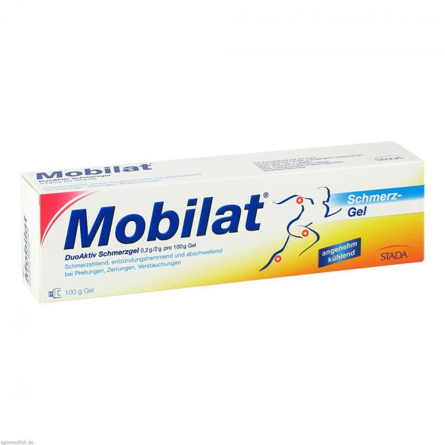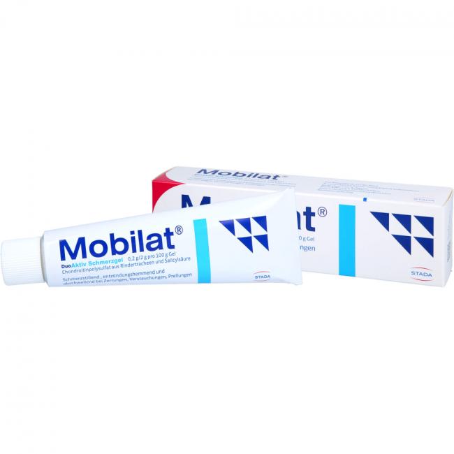 Mobilat DuoAktiv Schmerzgel 0,2 g/2 g pro 100 g Gel. Wirkstoff: Chondroitinpolysulfat aus Rindertracheen und Salicylsäure. Anwendungsgebiete: zur unterstützenden lokalen Behandlung von schmerzhaften stumpfen Traumen wie Zerrungen, Verstauchungen oder Prellungen, z.B. bei Sportverletzungen.