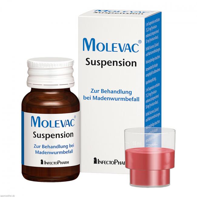 Molevac kann sowohl zu einer Mahlzeit als auch auf nüchternen Magen eingenommen werden. Wenn Sie eine größere Menge Suspension einnehmen müssen, verteilen Sie die Einnahme am besten auf drei Portionen: vor, während und nach der Mahlzeit. Bei Kindern kann Molevac Suspension mit Wasser oder anderen Flüssigkeiten (Fruchtsaft) verdünnt gegeben werden. Die Suspension ist vor Gebrauch zu schütteln.