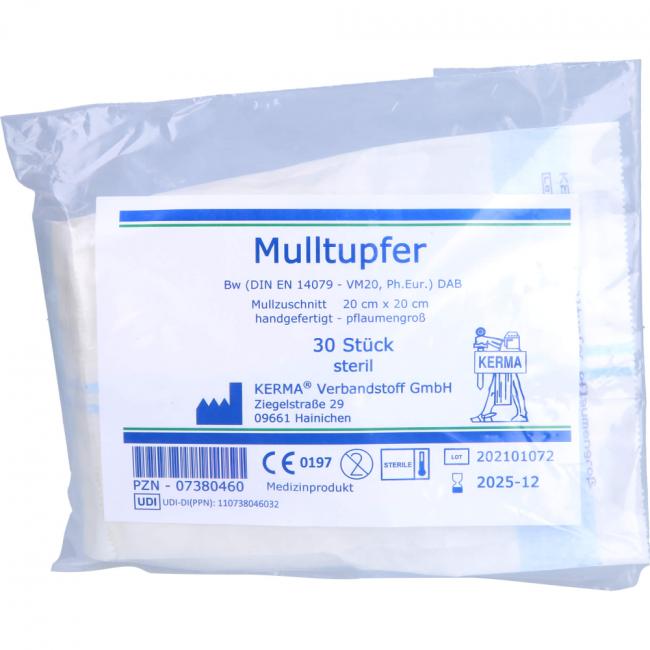 Mulltupfer werden aus 20-fädigem Verbandmull Baumwolle (DIN EN 14079 -VM20, Ph.Eur.) hergestellt. Diese hochsaugfähigen Schlinggazetupfer sind ballonförmig, ohne Röntgenkontrastfaden und ohne Gummiring. Mulltupfer werden steril (dampfsterilisiert bei 134°C) und unsteril angeboten.