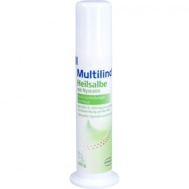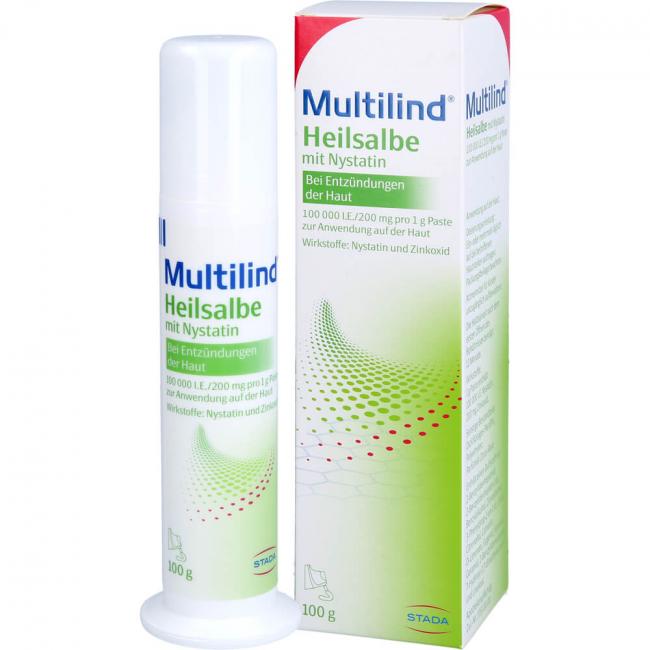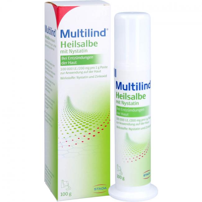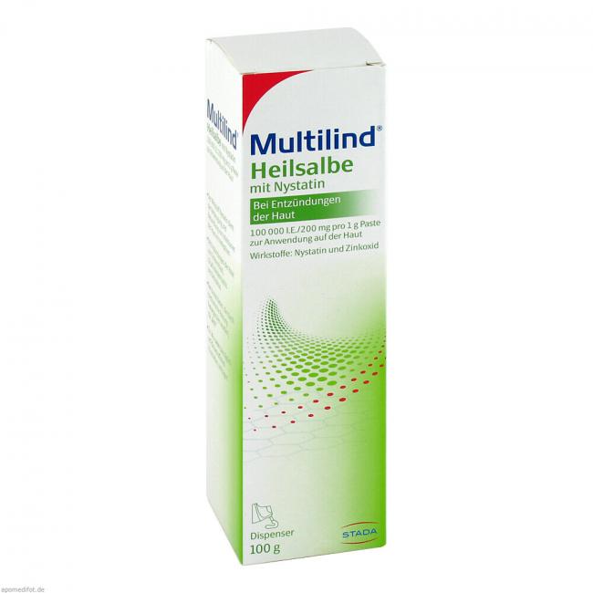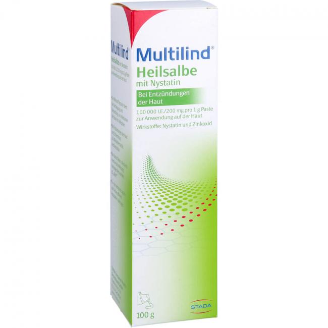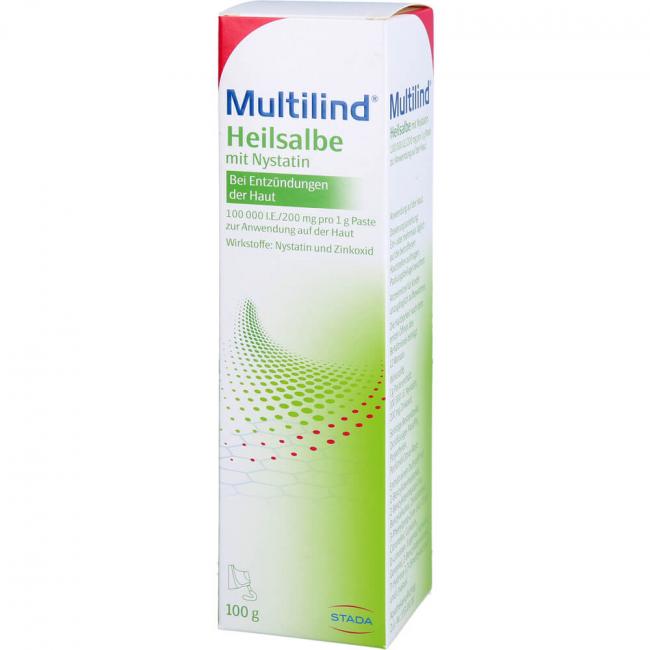 Multilind Heilsalbe mit Nystatin 100000 I.E./200 mg pro 1 g Paste. Anwendungsgebiete: bei Entzündungen der Haut und Schleimhaut, durch mechanische Reizung bedingtes Wundsein ("Wolf") und roten, juckenden und brennenden Herden in den Körperfalten, im Gesäß- und Brustbereich und zwischen den Oberschenkeln, z.B. Windeldermatitis.