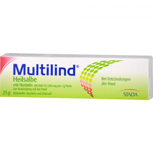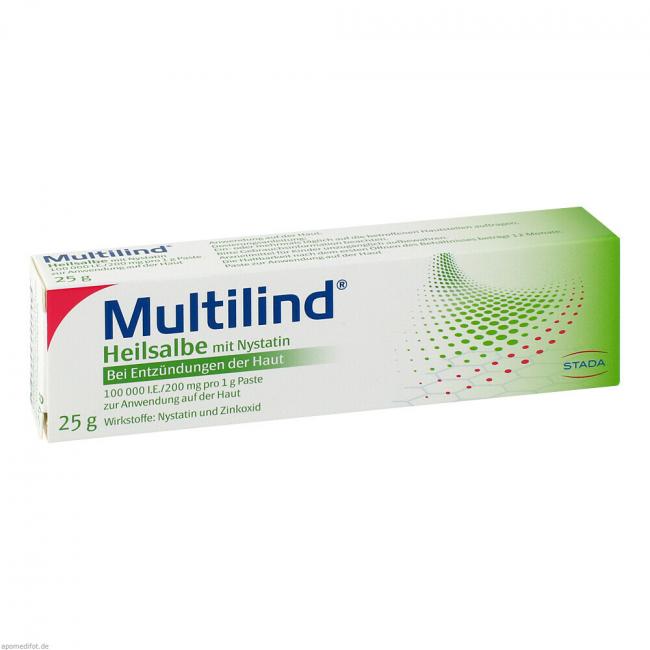 Multilind Heilsalbe mit Nystatin 100000 I.E./200 mg pro 1 g Paste. Anwendungsgebiete: bei Entzündungen der Haut und Schleimhaut, durch mechanische Reizung bedingtes Wundsein ("Wolf") und roten, juckenden und brennenden Herden in den Körperfalten, im Gesäß- und Brustbereich und zwischen den Oberschenkeln, z.B. Windeldermatitis.