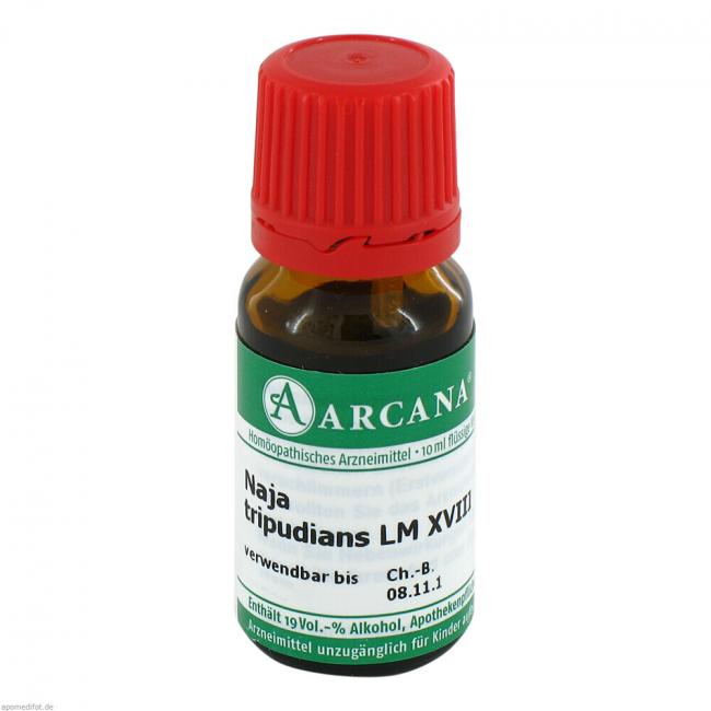 Naja tripudians LM XVIII . Anwendungsgebiete: Registriertes homöopathisches Arzneimittel, daher ohne Angabe einer therapeutischen Indikation. Warnhinweis: Enthält 19 Vol.-% Alkohol.