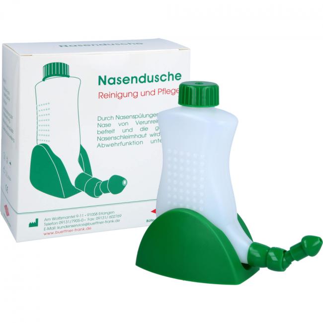 Durch Verschließen und Öffnen der Einfüllöffnung mit der Fingerkuppe lässt sich die Ausflussgeschwindigkeit regulieren. Die Nasendusche dient zur Reinigung der Nase und Nasenschleimhäute und kann bei trockenen Nasenschleimhäuten, Schnupfen, Erkältungen, Nasennebenhöhlen-Erkrankungen, Heuschnupfen und Allergien angewendet werden.