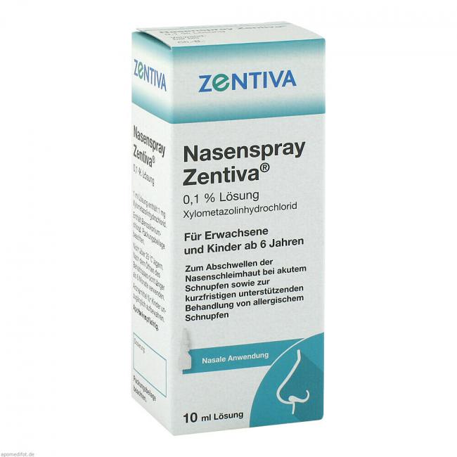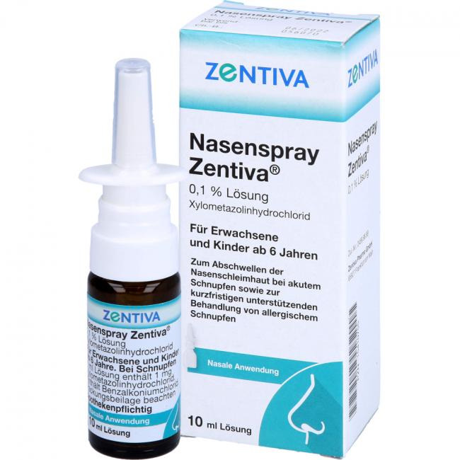 Nasenspray Zentiva 0,1%, Lösung. Wirkstoff: Xylometazolinhydrochlorid. Anwendungsgebiete: um Abschwellen der Nasenschleimhaut bei akutem Schnupfen, bei anfallsweise auftretendem Fließschnupfen (Rhinitis vasomotorica) sowie zur kurzfristigen unterstützenden Behandlung von allergischem Schnupfen (Rhinitis allergica) wie Heuschnupfen. Warnhinweis: Enthält Benzalkoniumchlorid.