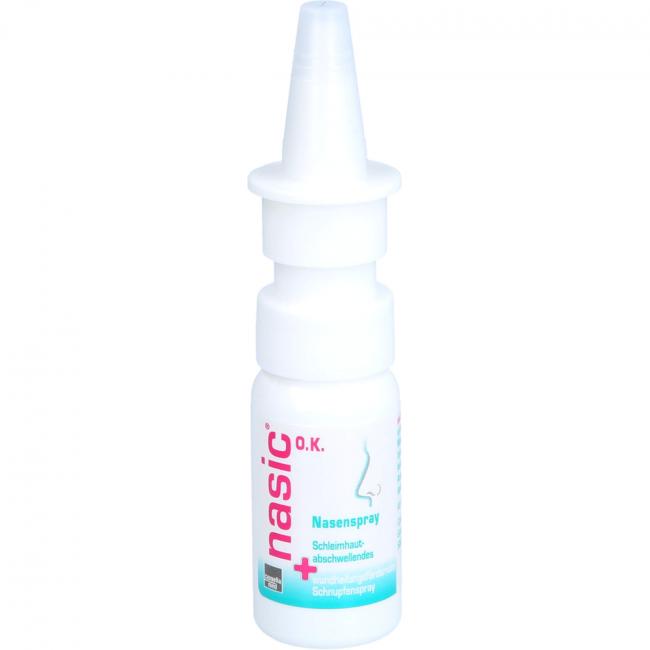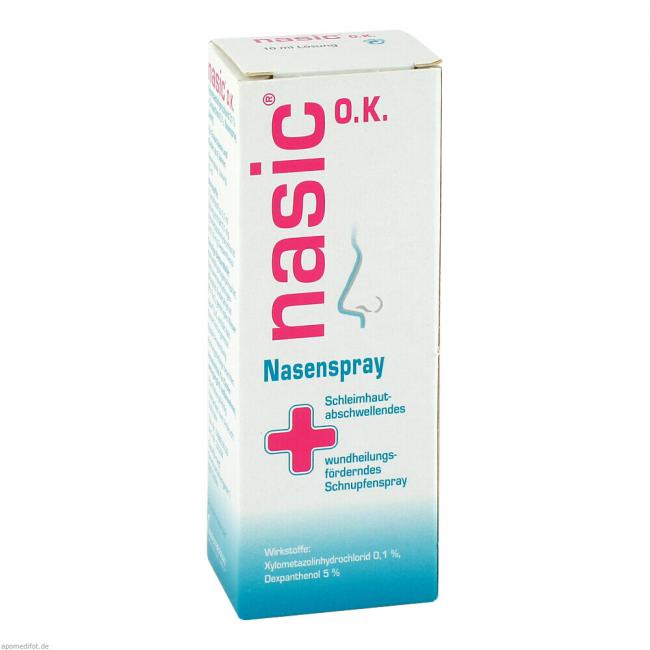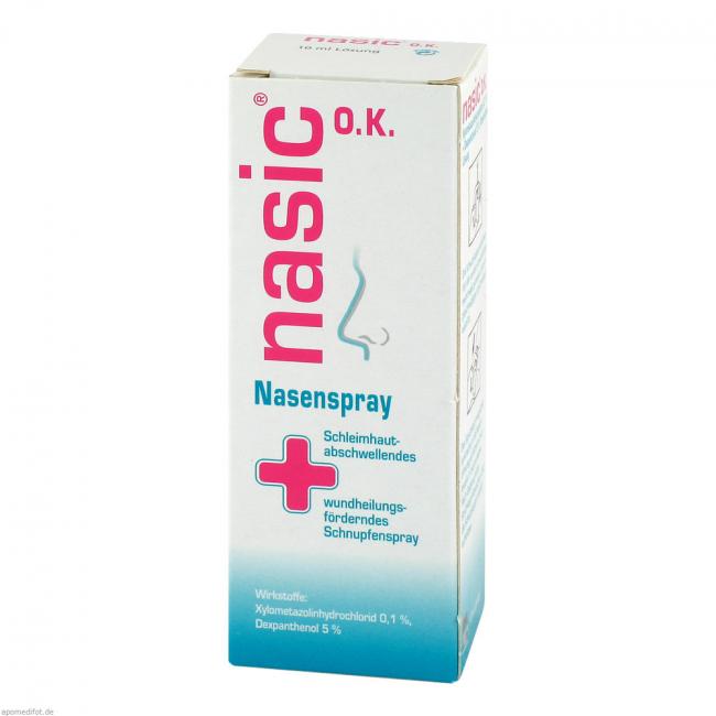 nasic O.K. Ist ein Nasenspray. Der darin enthaltene Wirkstoff Xylometazolinhydrochlorid verengt die Gefäße und bewirkt dadurch eine Abschwellung der Nasenschleimhaut. Der zusätzlich enthaltene Wirkstoff Dexpanthenol ist ein Abkömmling des Vitamins Pantothensäure, das die Wundheilung fördert und die Schleimhaut schützt. nasic O.K. wird angewendet zur Abschwellung der Nasenschleimhaut bei Schnupfen und zur unterstützenden Behandlung der Heilung von Haut- und Schleimhautschäden (Läsionen), anfallsweise auftretendem Fließschnupfen (Rhinitis vasomotorica) und zur Behandlung der Nasenatmungsbehinderung nach operativen Eingriffen an der Nase. nasic O.K. Ist für Erwachsene und Kinder ab 6 Jahren bestimmt.