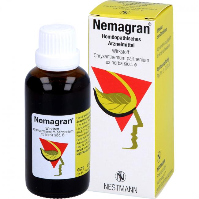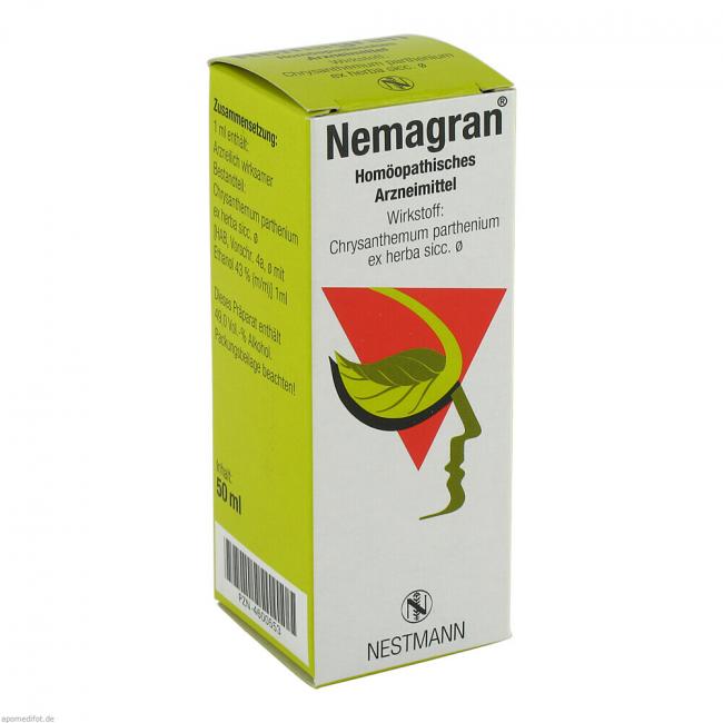 Nemagran, Urtinktur zum Einnehmen. Anwendungsgebiete: Registriertes homöopathisches Arzneimittel, daher ohne Angabe einer therapeutischen Indikation. Warnhinweis: Enthält 49 Vol.-% Alkohol!