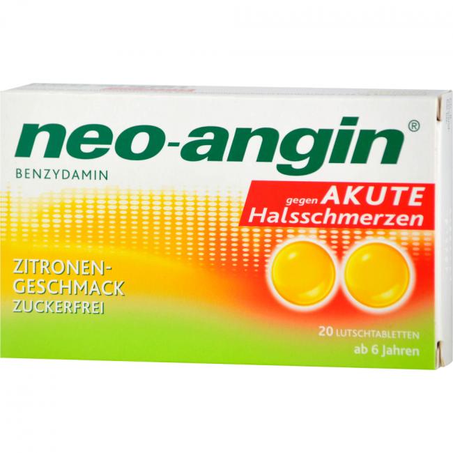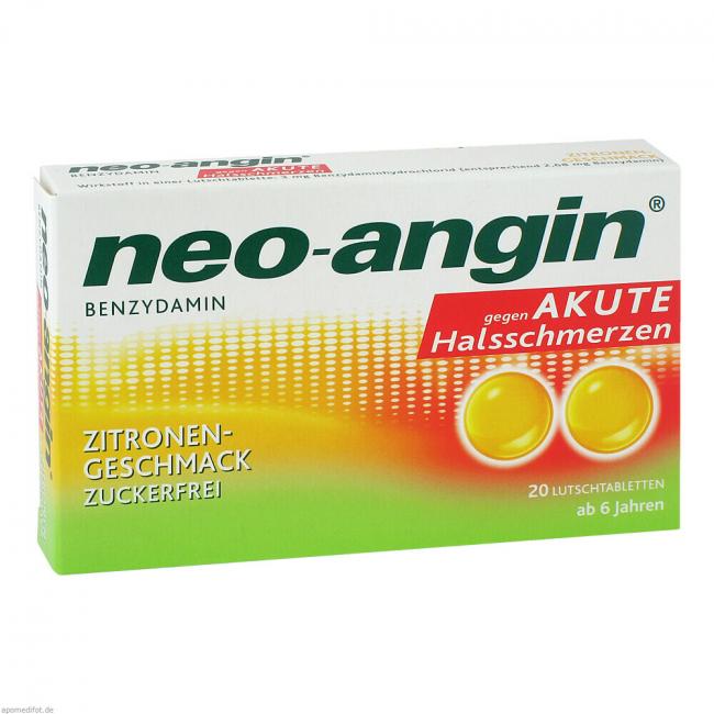 neoangin gegen akute Halsschmerzen Zitronengeschmack, Lutschtabletten. Wirkstoff: Benzydaminhydrochlorid. Anwendungsgebiete: zur symptomatischen, lokalen Behandlung von akuten Halsschmerzen, die mit den typischen Entzündungssymptomen wie Schmerzen, Rötung oder Schwellung im Mund- und Rachenraum einhergehen. Warnhinweis: Enthält Isomalt und Aspartam.