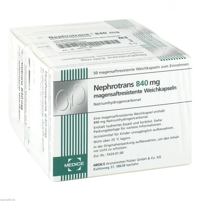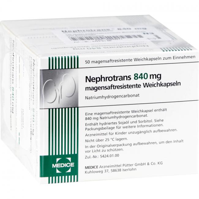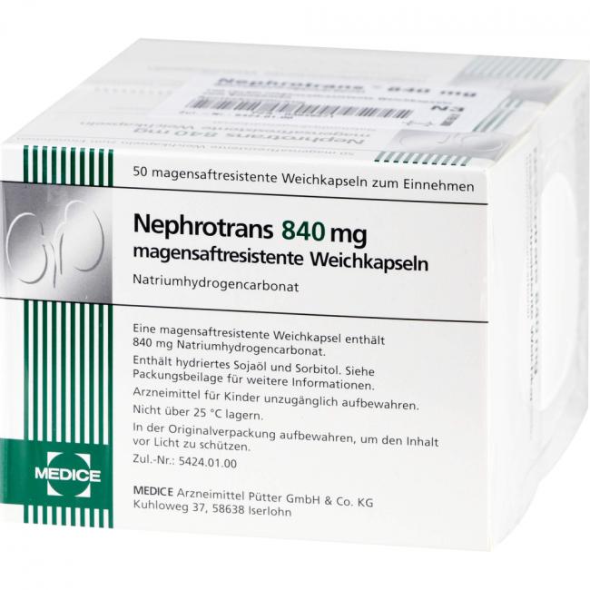 Nephrotrans 840 mg magensaftresistente Weichkapseln. Wirkstoff: Natriumhydrogencarbonat. Anwendungsgebiete: Nephrotrans 840 mg ist ein Mittel zur Behandlung der stoffwechselbedingten Übersäuerung des Blutes (metabolische Acidose) und zur Erhaltungsbehandlung gegen erneutes Auftreten der stoffwechselbedingten Übersäuerung des Blutes bei chronischer Minderleistung der Nieren (chronische Niereninsuffizienz).