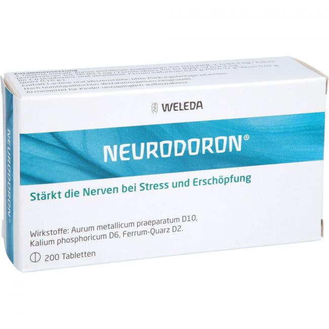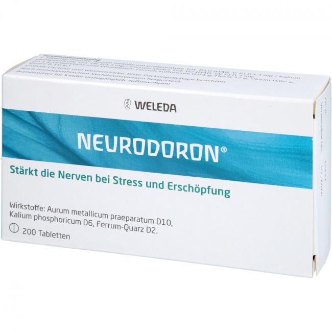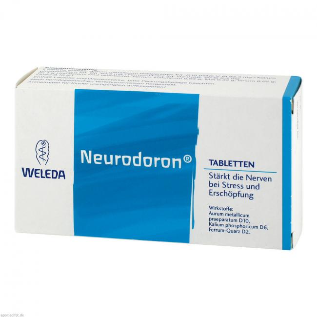 Weleda Neurodoron Tabletten. Anwendungsgebiete: Gemäß der anthroposophischen Menschen- und Naturerkenntnis gehören zu den Anwendungsgebieten die Harmonisierung und die Stabilisierung des Wesensgliedergefüges bei nervöser Erschöpfung und Stoffwechselschwäche, z.B. Nervosität, Angst- und Unruhezustände, depressive Verstimmung, Rekonvaleszenz, Kopfschmerzen. Warnhinweis: Dieses Arzneimittel enthält Lactose.