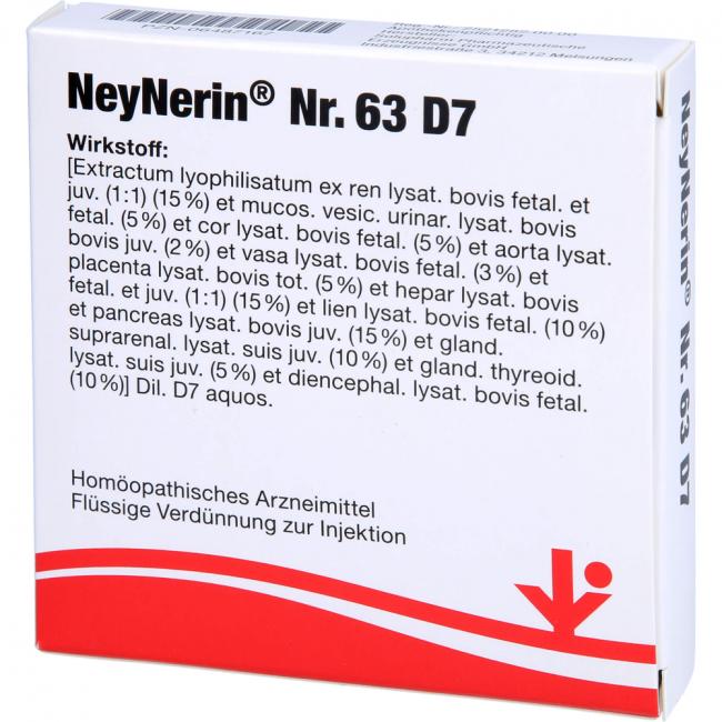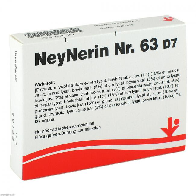 NeyNerin Nr. 63 D7. Wirkstoff: [Extractum lyophilisatum ex ren lysat. bovis fetal, et juv. (1:1) (15%) et mucos. vesic. urinar. lysat. bovis fetal. (5%) et cor lysat. bovis fetal. (5 %) et aorta lysat. bovis juv. (2 %) et vasa lysat. bovis fetal. (3%) et placenta lysat. bovis tot. (5%) et hepar lysat. bovis fetal, et juv. (1:1) (15%) et lien lysat. bovis fetal. (10%) et pancreas lysat. bovis juv. (15%) et gland. suprarenal, lysat. suis juv. (10%) et gland. thyreoid. lysat. suis juv. (5 %) et diencephal. lysat. bovis fetal. (10 %)] Dil. D7 aquos. Anwendungsgebiete: Registriertes homöopathisches Arzneimittel, daher ohne Angabe einer therapeutischen Indikation.