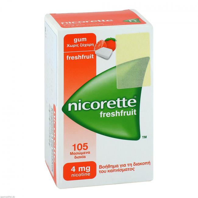 Nicorette Kaugummi 4 mg freshfruit ist ein dragiertes viereckiges wirkstoffhaltiges Kaugummi. Es ist in Packungen mit 30, 105 und 210 wirkstoffhaltigen Kaugummis erhältlich.