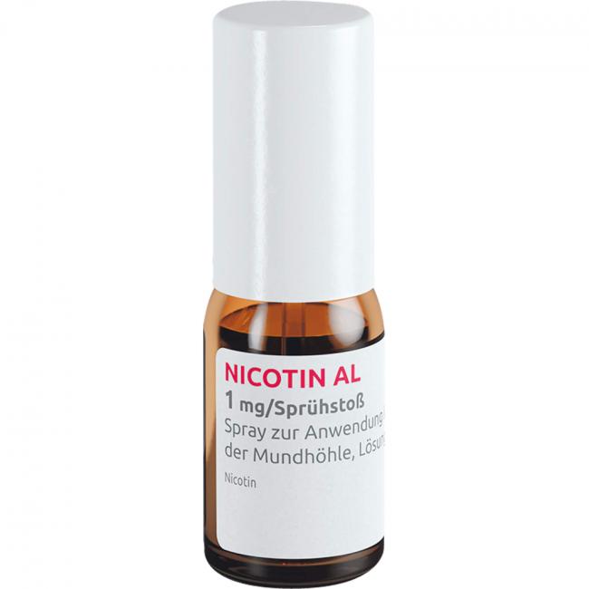 Nicotin AL 1 mg/Sprühstoß Spray zur Anwendung in der Mundhöhle, Lösung wird abgefüllt in eine 15 ml Braunglasflasche (Typ III) mit einer mechanischen Sprühpumpe und einer Schutzkappe. Die sichtbaren Teile der Sprühpumpe sind folgende: PP Auslöseknopf, PP Schutzkappe, aus LDPE und PP bestehendes Ansaugröhrchen. Nicotin AL ist eine klare, farblose bis bräunliche Lösung. Jede Flasche enthält 13,2 ml Lösung entsprechend mindestens 150 Sprühstößen. Nicotin AL 1 mg/Sprühstoß Spray zur Anwendung in der Mundhöhle ist in Packungen mit 1 oder 2 Flaschen erhältlich.