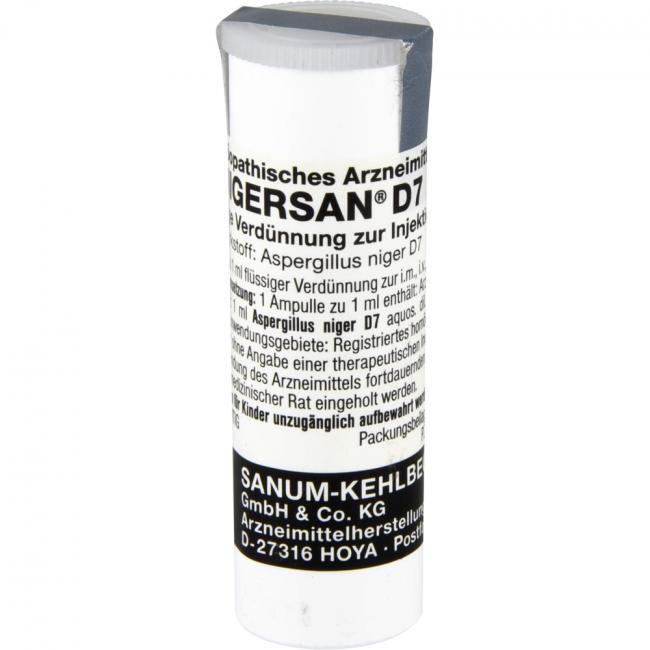 Nigersan D7, Flüssige Verdünnung zur Injektion. Wirkstoff: Aspergillus niger e volumine mycelii (lyophil., steril.) Dil. D7 aquos. Anwendungsgebiete: Registriertes homöopathisches Arzneimittel, daher ohne Angabe einer therapeutischen Indikation.