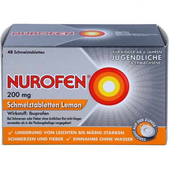 Nurofen 200 mg Schmelztabletten Lemon. Wirkstoff: Ibuprofen. Anwendungsgebiete: zur Linderung von leichten bis mäßig starken Schmerzen wie Kopfschmerzen, Zahnschmerzen und Regelschmerzen, zur Fiebersenkung. Warnhinweis: Enthält Aspartam.