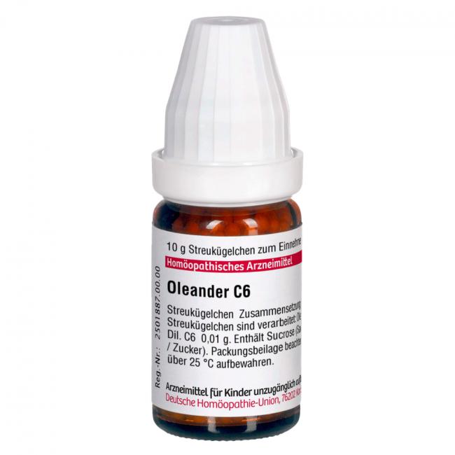 Oleander C 6. Anwendungsgebiete: Registriertes homöopathisches Arzneimittel, daher ohne Angabe einer therapeutischen Indikation. Warnhinweis: Dieses Arzneimittel enthält Sucrose (Saccharose / Zucker).