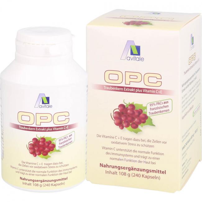 Nahrungsergänzungsmittel mit 200 mg OPC-reichem Traubenkernextrakt mit mindestens 60% OPC (mindestens 120 mg) sowie Vitamin C und E