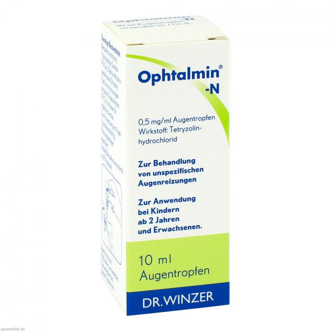 Ophtalmin-N 0,5 mg/ml Augentropfen. Wirkstoff: Tetryzolinhydrochlorid. Anwendungsgebiete: Augenreizungen, z.B. durch Rauch, Wind, gechlortes Wasser und Licht und allergischen Entzündungen des Auges, z.B. Heufieber und Blütenstaubüberempfindlichkeit.