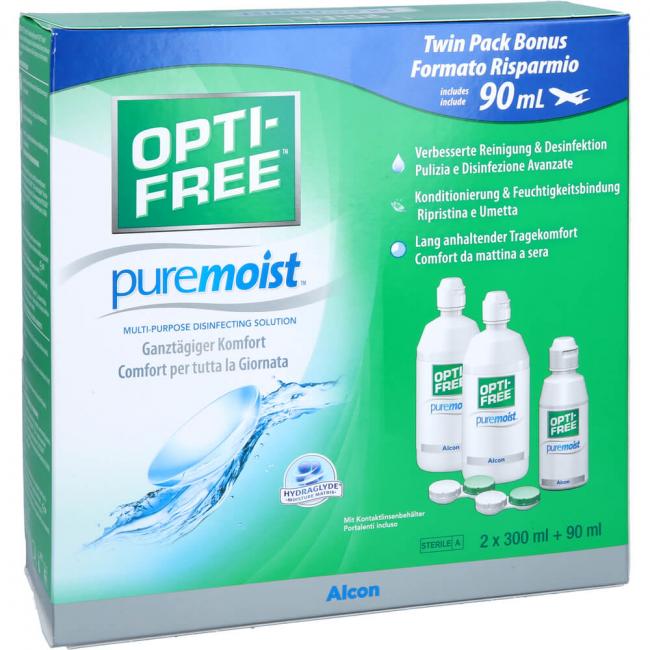 Die Multifunktionale-Desinfektionslösung Opti-Free PureMoist wurde speziell an die Bedürfnisse von Silikon-Hydrogel-Kontaktlinsen angepasst. Die effektive All-in-One-Lösung reinigt, desinfiziert, entfernt Proteine sowie Lipide und ist für die Aufbewahrung aller weichen Kontaktlinsen geeignet. Opti-Free PureMoist kann durch seine biokompatible Wirkungsweise der Desinfizierung Pilze sowie Keime effektiv reduzieren und sorgt damit für eine äußerst hygienische Kontaktlinsenpflege. Die integrierte HydraGlyde Moisture Matrix ist ein innovativer Inhaltsstoff, der die Kontaktlinse mit Feuchtigkeit umhüllt und für eine besonders langanhaltende Hydrierung der Linsen sorgt. Dadurch verleiht Opti-Free PureMoist Kontaktlinsenträgern ein komfortables Trageerlebnis von morgens bis abends.