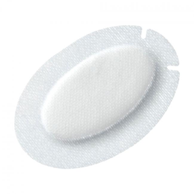 Sterile Augenkompresse, selbstklebend. Anschmiegsames und luftdurchlässiges Vlies mit dicker Wundauflage. Nasale Schlitze für bessere Haftung im Nasenbereich.