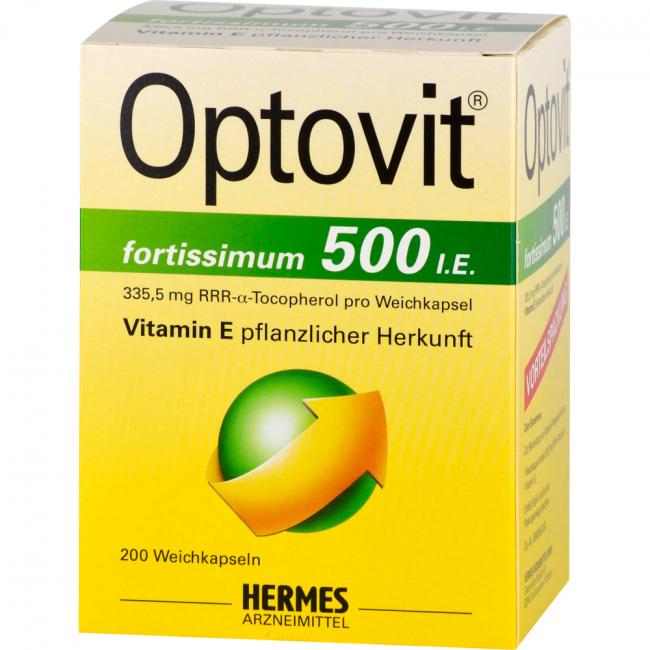 Optovit fortissimum 500 I.E.. Wirkstoff: RRR-alpha-Tocopherol. Anwendungsgebiete: zur Behandlung eines Vitamin-E-Mangels.
