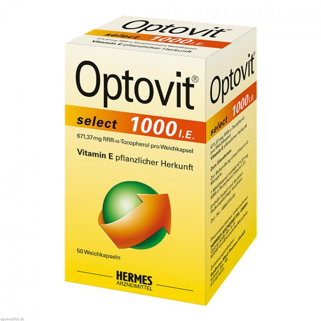 Optovit select, Weichkapseln. Wirkstoff: 671,37 mg RRR-alpha-Tocopherol. Anwendungsgebiete: wird angewendet zur Behandlung eines Vitamin-E-Mangels.