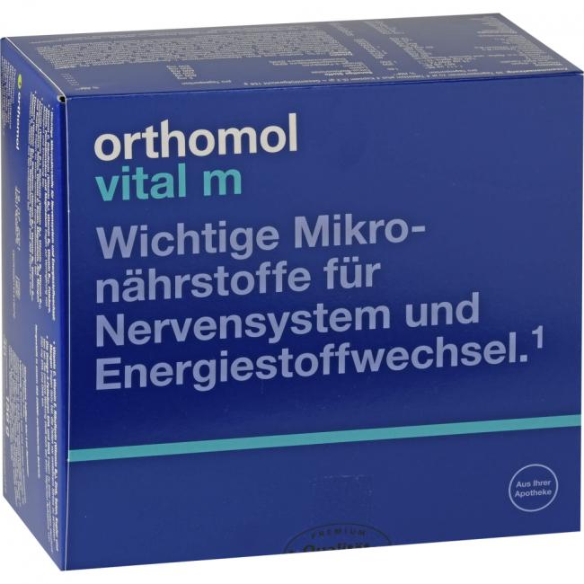 Orthomol Vital m ist ein Nahrungsergänzungsmittel. Wichtige Mikronährstoffe für Nervensystem und Energiestoffwechsel. Täglich den Inhalt eines Beutels (= Tagesportion) vorzugsweise einzeln mit viel Flüssigkeit zu oder nach einer Mahlzeit einnehmen. Die Tabletten und Kapseln können auch in beliebiger Reihenfolge über den Tag verteilt eingenommen werden. Mikronährstoffe werden täglich vom Körper gebraucht, eine regelmäßige Verwendung über einen längeren Zeitraum ist daher empfehlenswert.