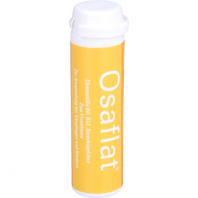 Osaflat Chamomilla Dil. D12, Streukügelchen. Anwendungsgebiete: Das Anwendungsgebiet entspricht dem homöopathischen Arzneimittelbild. Dazu gehören: Blähungen, Dreimonatskoliken, ärgerliche Gereiztheit und große Ungeduld.
