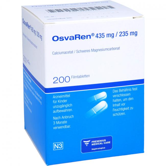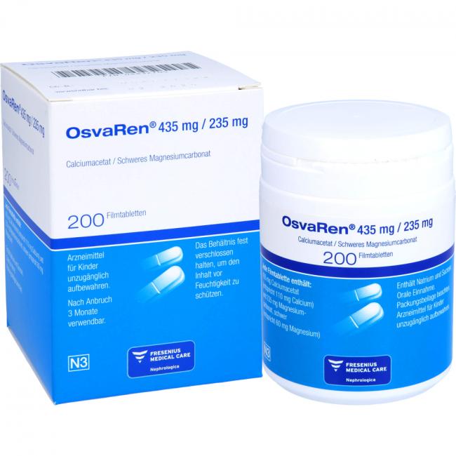 OsvaRen 435 mg/235 mg Filmtabletten. Anwendungsgebiete: zur Behandlung von hohen Blutphosphatwerten bei Patienten mit chronischer Niereninsuffizienz, bei denen eine Dialyse (Blutwäsche) durchgeführt wird (Hämodialyse, Peritonealdialyse).