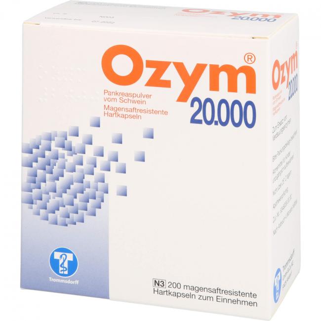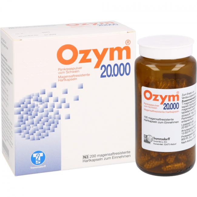 Ozym 20.000, magensaftresistente Hartkapseln. Wirkstoff: Pankreaspulver vom Schwein. Anwendungsgebiete: zur Behandlung von Verdauungsstörungen (Maldigestion) verwendet, die durch eine verminderte oder fehlende Funktion der Bauchspeicheldrüse (exokrine Pankreasinsuffizienz) verursacht werden.