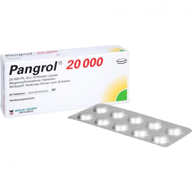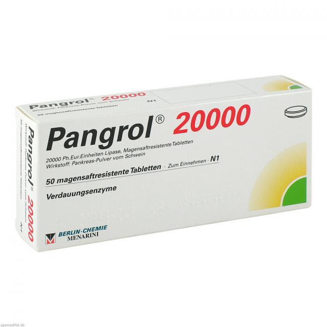 Pangrol 20.000, 20.000 Ph.-Eur.-Einheiten Lipase, magensaftresistente Hartkapseln. Wirkstoff: Pankreas-Pulver vom Schwein. Anwendungsgebiete: zur Behandlung von Verdauungsstörungen, die durch eine verminderte oder fehlende Funktion der Bauchspeicheldrüse verursacht werden.