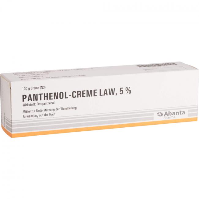 Panthenol-Creme LAW 5%. Wirkstoff: Dexpanthenol. Anwendungsgebiete: zur Unterstützung der Heilung bei oberflächlichen leichten Haut- und Schleimhautschädigungen.