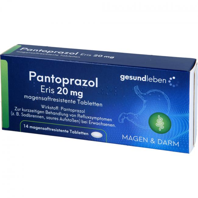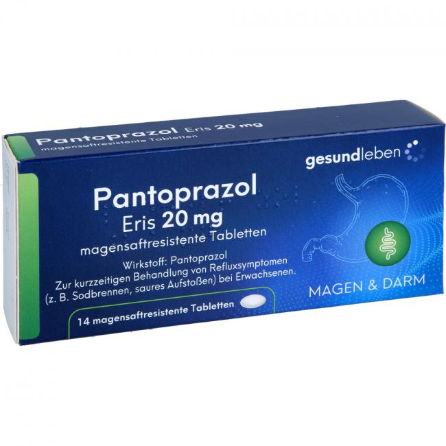 Pantoprazol Eris 20 mg magensaftresistente Tabletten. Wirkstoff: Pantoprazol. Anwendungsgebiete: Zur kurzzeitigen Behandlung von Reflux-Symptomen (z.B. Sodbrennen, saures Aufstoßen) bei Erwachsenen.