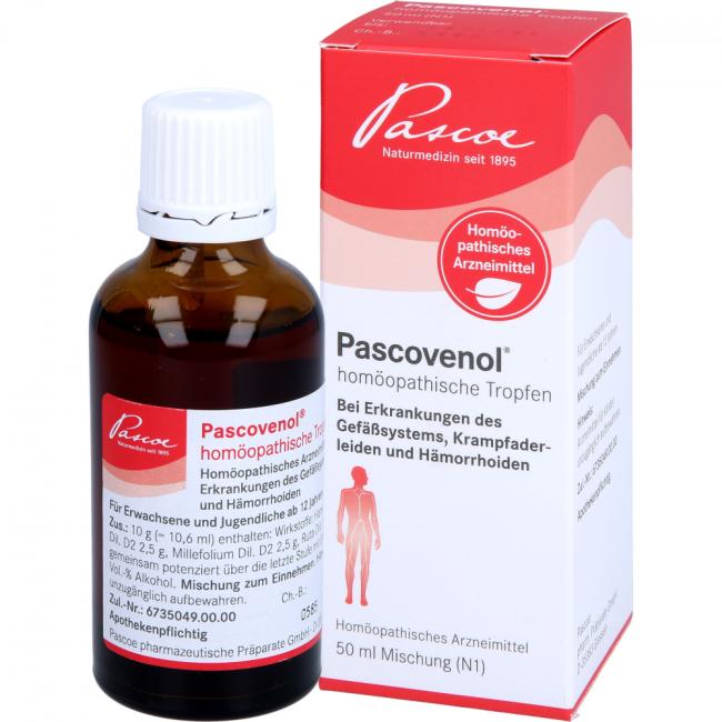 Pascovenol homöopathische Tropfen ist ein homöopathisches Arzneimittel zur Anwendung bei Erkrankungen des Gefäßsystems. Die Anwendungsgebiete leiten sich von den homöopathischen Arzneimittelbildern ab. Dazu gehören: Krampfaderleiden und Hämorrhoiden. Bei Krampfaderleiden sollten weitere vom Arzt verordnete Maßnahmen wie Wickeln der Beine, Tragen von Stützstrümpfen oder kalte Wassergüsse unbedingt eingehalten werden. Treten plötzlich ungewohnt starke Beschwerden vor allem an einem Bein auf, die sich durch Schwellung, Verfärbungen der Haut, Spannungs- oder Hitzegefühl sowie Schmerzen bemerkbar machen, sollte unverzüglich ein Arzt aufgesucht werden, da diese Merkmale Anzeichen einer ernsten Erkrankung (Beinvenenthrombose) sein können.