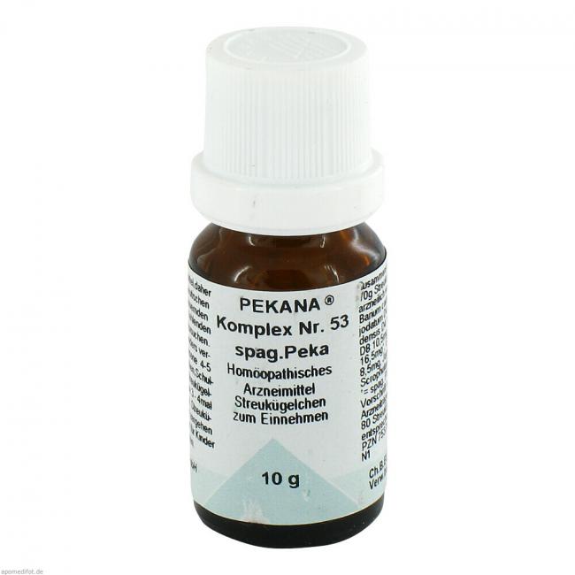 Pekana Komplex Nr. 53 spag. Peka, Streukügelchen. Anwendungsgebiete: Registriertes homöopathisches Arzneimittel, daher ohne Angabe einer therapeutischen Indikation.