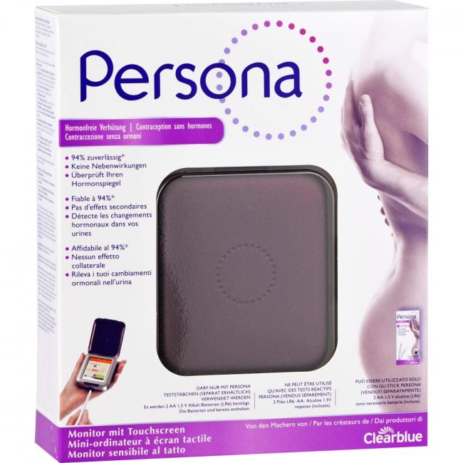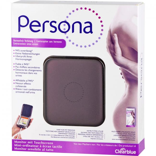 Persona besteht aus einem Monitor mit Touchscreen-Bildschirm und Teststäbchen (mit diesen Teststäbchen beobachten Sie die Hormonveränderungen in Ihrem Urin). Teststäbchen und Batterien (2 AA 1,5 V Alkali-Batterien) sind separat erhältlich. Für den ersten Zyklus, In dem Sie Persona anwenden, benötigen Sie 16 Teststäbchen. Für alle weiteren Zyklen benötigen Sie jeweils 8 Teststäbchen.