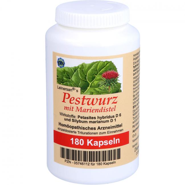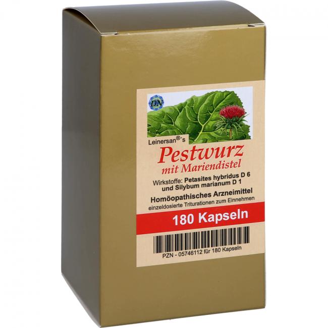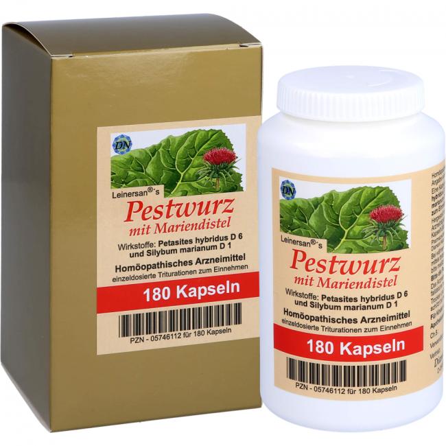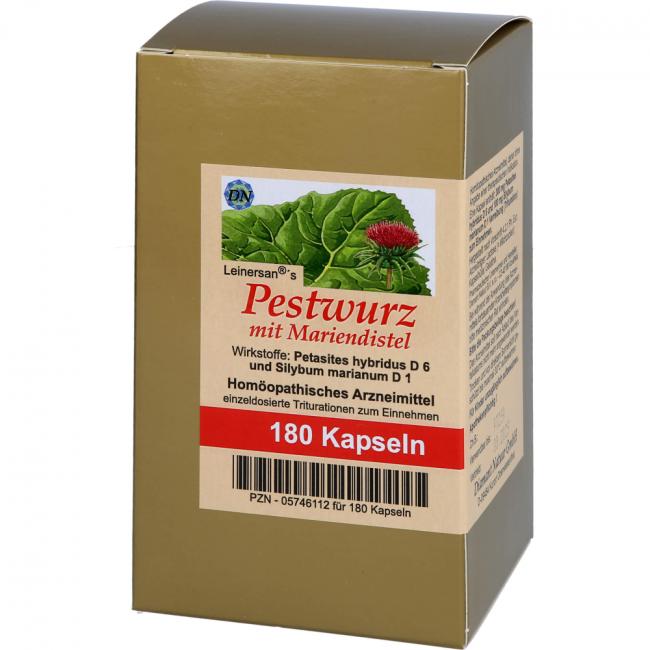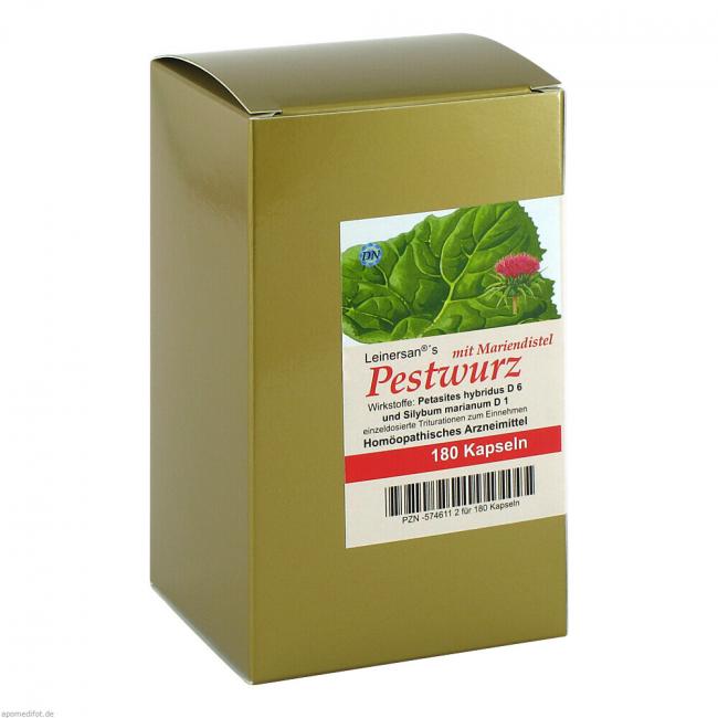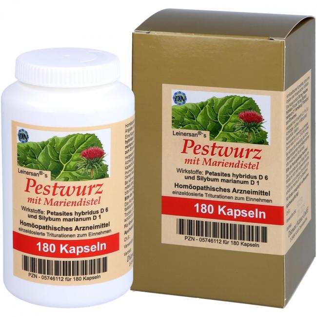 Leinersan's Pestwurz mit Mariendistel, Kapseln. Wirkstoffe: Petasites Petasites Hybridus D6, Silybum Marianum D1. Anwendungsgebiete: Registriertes homöopathisches Arzneimittel, daher ohne Angabe einer therapeutischen Indikation.