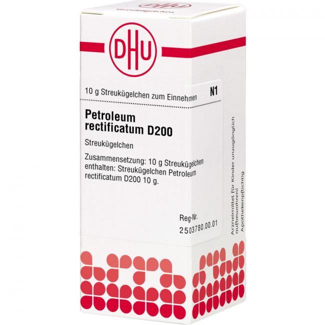 Petroleum Rectificatum D 200. Anwendungsgebiete: Registriertes homöopathisches Arzneimittel, daher ohne Angabe einer therapeutischen Indikation. Warnhinweis: Dieses Arzneimittel enthält Sucrose (Saccharose / Zucker).