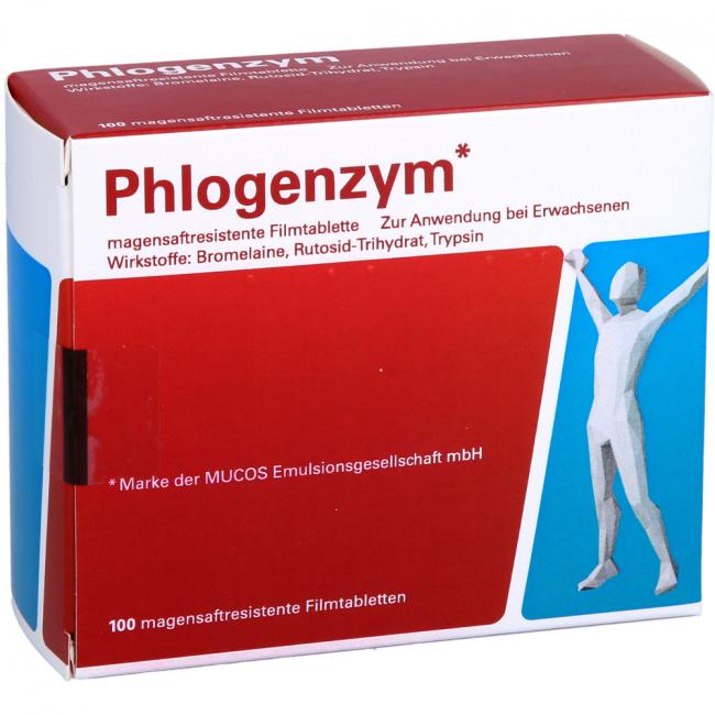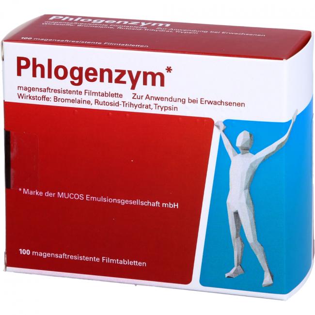 Phlogenzym, magensaftresistente Tabletten. Wirkstoff: Bromelain. Anwendungsgebiete: Bei akuten Schwellungszuständen nach Operationen und Verletzungen, insbesondere der Nase und Nebenhöhlen. Warnhinweis: Enthält Lactose.