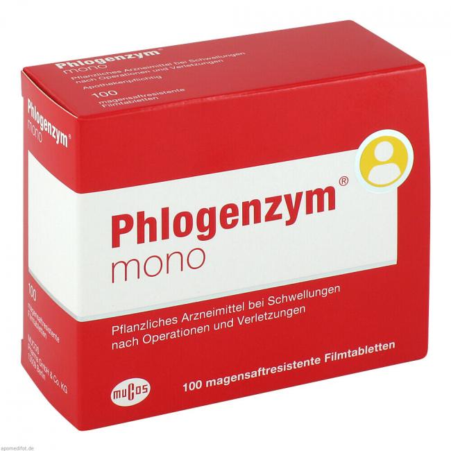 Phlogenzym mono, magensaftresistente Tabletten. Wirkstoff: Bromelain. Anwendungsgebiete: Akute Schwellungszustände nach Operationen und Verletzungen, insbesondere der Nase und Nebenhöhlen.