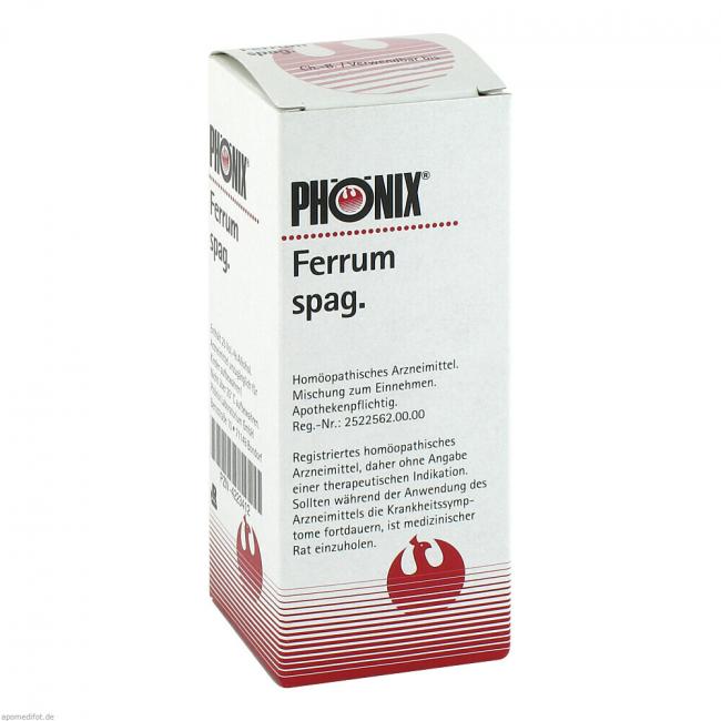 Phönix Ferrum spag. Mischung. Anwendungsgebiete: Registriertes homöopathisches Arzneimittel, daher ohne Angabe einer therapeutischen Indikation. Warnhinweis: Enthält 25 Vol.-% Alkohol!