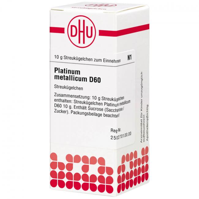 Platinum metallicum D 60. Anwendungsgebiete: Registriertes homöopathisches Arzneimittel, daher ohne Angabe einer therapeutischen Indikation. Warnhinweis: Dieses Arzneimittel enthält Sucrose (Saccharose / Zucker).