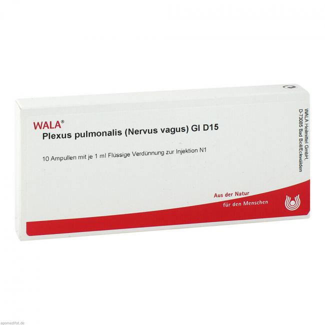 Plexus pulmonalis (Nervus vagus) Gl D15, Flüssige Verdünnung zur Injektion. Wirkstoff: Plexus pulmonalis, Nervus vagus bovis Gl. Anwendungsgebiete: Registriertes homöopathisches Arzneimittel der anthroposophischen Therapierichtung, daher ohne Angabe einer therapeutischen Indikation.