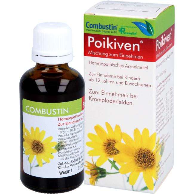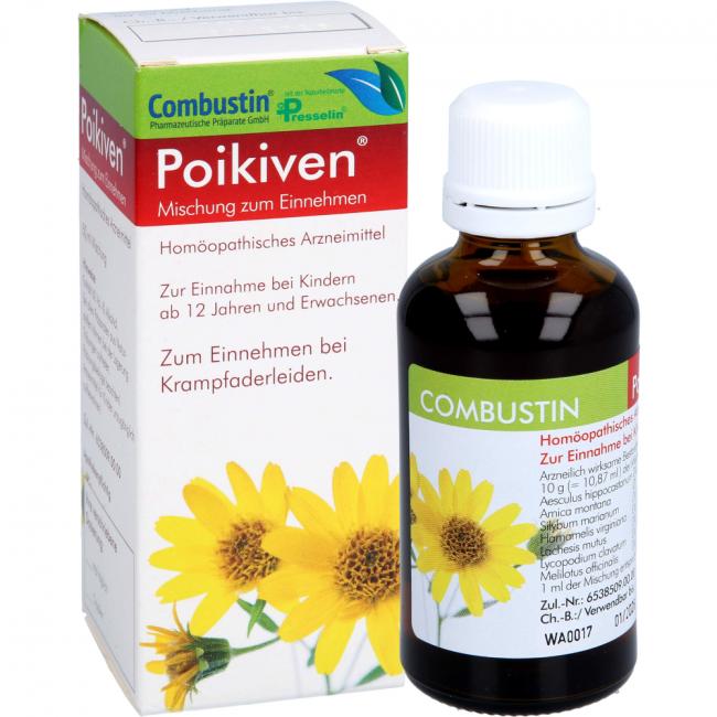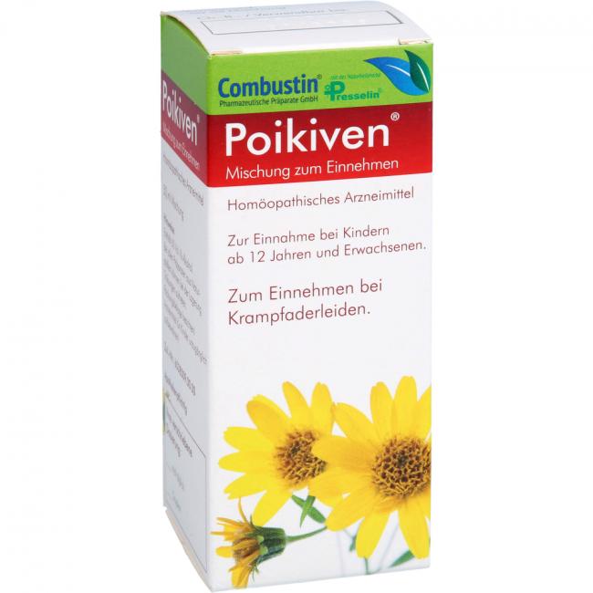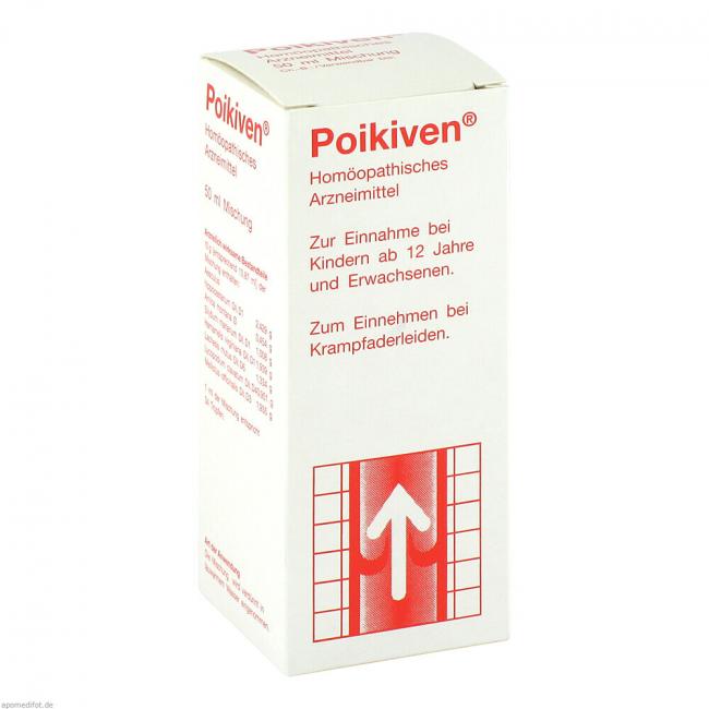 Poikiven, Mischung. Anwendungsgebiete: Die Anwendungsgebiete leiten sich von den homöopathischen Arzneimittelbildern ab. Dazu gehören: Beschwerden bei Krampfaderleiden. Warnhinweis: Enthält 60 Vol.-% Alkohol!