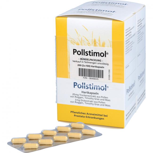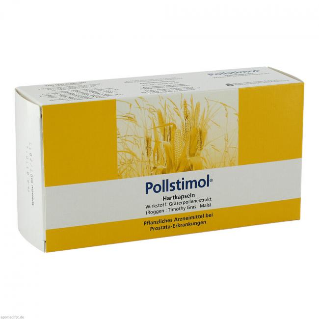 Pollstimol Hartkapseln. Wirkstoff: Trockenextrakt aus Pollen von Roggen, Timothy Gras und Mais und Dickextrakt aus Pollen von Roggen, Timothy Gras und Mais. Anwendungsgebiete: bei Miktionsbeschwerden bei gutartiger Prostatavergrößerung (BPH) Stadium I bis II nach Alken bzw. II bis III nach Vahlensieck und bei chronischer abakterieller Prostatitis. Warnhinweis: Enthält Lactose.